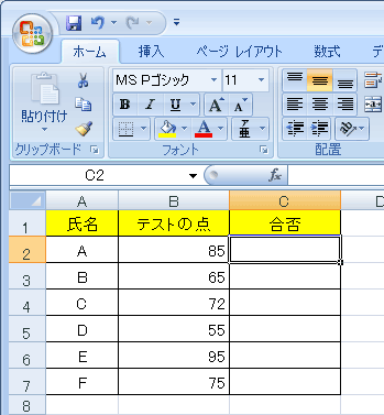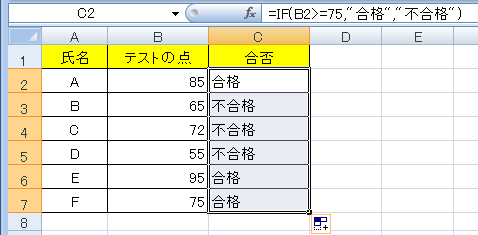• 下記のような表で、テストの点数が75点以上の場合には「合格」、75点未満では「不合格」を表示させます。