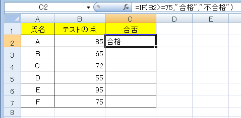 1. B2のテストの点数が85点なので、C2に「合格」と表示されました。