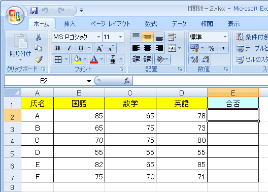 1. E2には、A君の合否として、数学が70点以下なので、E2に「不合格」と表示されました。