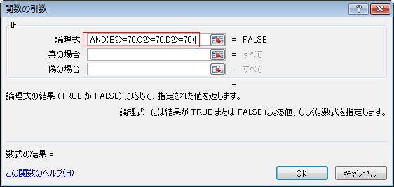 入力は「AND(B2>=70,C2>=70,D2>=70)」となります(下記ワンポイントで説明)。入力は半角でします。