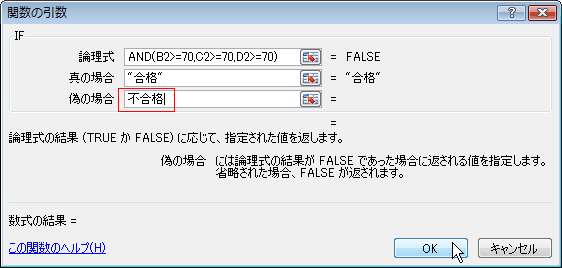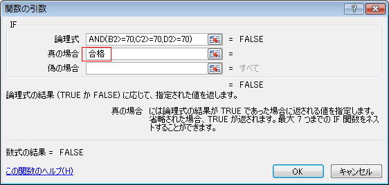 • 下図ではまだ「”合格”」とは表示されていませんが、次の指定の「偽の場合」の欄をクリックで選択したら、文字の場合には自動的に””は付けられますので、 「””」の入力は要はありません。