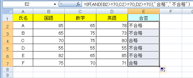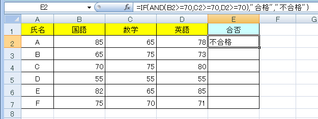 • 下記のような表で、テストの点数が 国語・数学・英語の全てが70点以上の場合には「合格」、1つでも70点未満があれば「不合格」を表示させます。