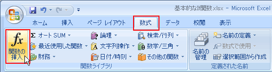2. 【数式】タブ→[関数ライブラリー]の【関数の挿入】をクリックします。
