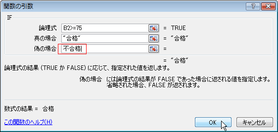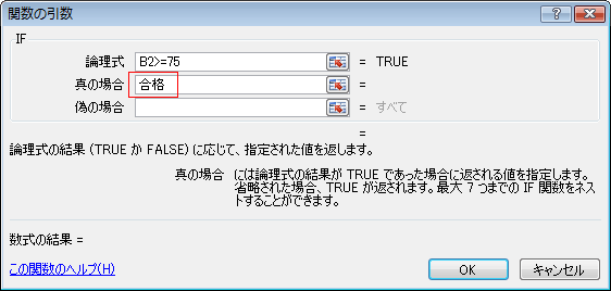 ここでは、「75点以上」という論理式に対して、真の場合には「合格」、偽の場合には「不合格」という指定をします。